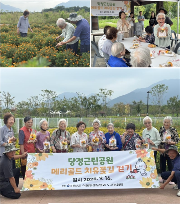 하남시(시장 이현재)16일 당정근린공원 메리골드 꽃길에서 영락경로원 치매 어르신들과 함께 치유농업 프로그램을 진행했다고 밝혔다. 황금빛으로 물든 꽃들은 어르신들에게 편안한 휴식과 작은 웃음을 전했다.