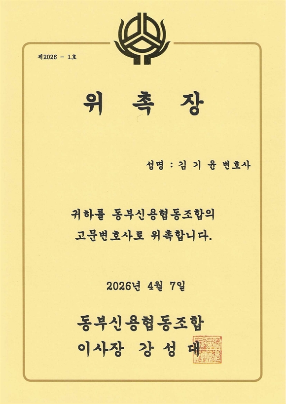 동부신협은 7일 김기윤 변호사를 조합 운영 전반에 걸친 법률 자문 및 대응 체계를 강화하기 위해 고문변호사로 위촉하였다고 밝혔다. 이번 위촉은 단순 자문 위촉을 넘어 조합과 조합원이 직면할 수 있는 다양한 법률 리스크에 대해 상시 대응 가능한 구조를 마련했다는 점에서 의미가 크다.