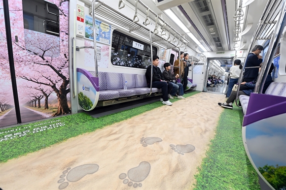 특히 발밑으로는 서정적인 모랫길이 펼쳐지고 머리 위로는 벚꽃 비가 내리는 듯한 연출은 단순한 이동 수단이었던 지하철을 짧은 여행의 설렘을 주는 공간으로 탈바꿈시켰다.