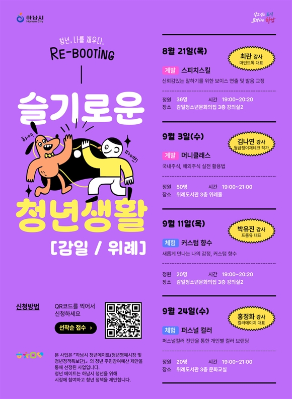 오는 9월 3일부터는 △‘머니클래스’ △‘커스텀 향수’ △‘퍼스널 컬러’ 프로그램이 감일청소년문화의집과 위례도서관에서 격주로 운영된다. 참여 희망자는 월별 일정에 맞춰 네이버폼(https://naver.me/xt4mWAXK)을 통해 신청할 수 있으며, 자세한 사항은 하남시청 홈페이지에서 확인 가능하다.