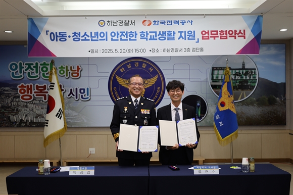 하남경찰서는 20일 오후, 하남경찰서 검단 홀에서 한국전력공사 하남지사와 아동·청소년의 안전한 학교생활 지원을 위한 업무협약체결식을 진행했다.